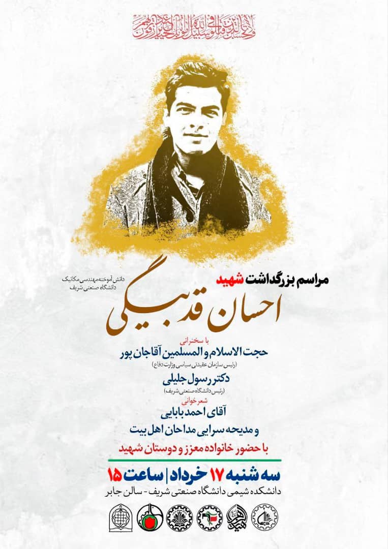 مراسم بزرگداشت شهید احسان قدبیگی مراسم بزرگداشت شهید احسان قدبیگی دانشآموخته مهندسی مکانیک دانشگاه صنعتی شریف 📌 با سخنرانی: 👤 حجتالاسلام و المسلمین آقاجانپور ▫️ رئیس سازمان عقیدتی سیاسی وزارت...